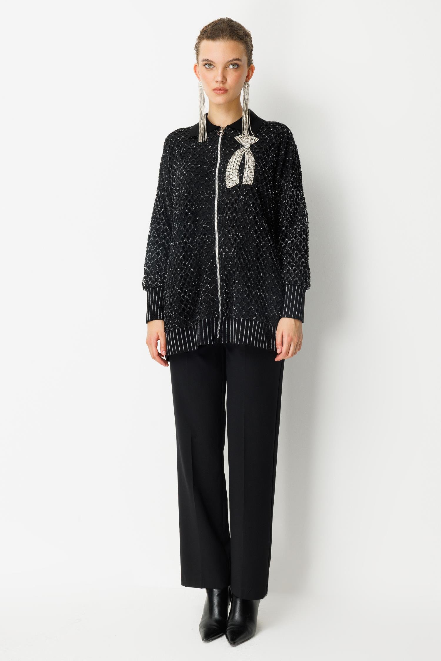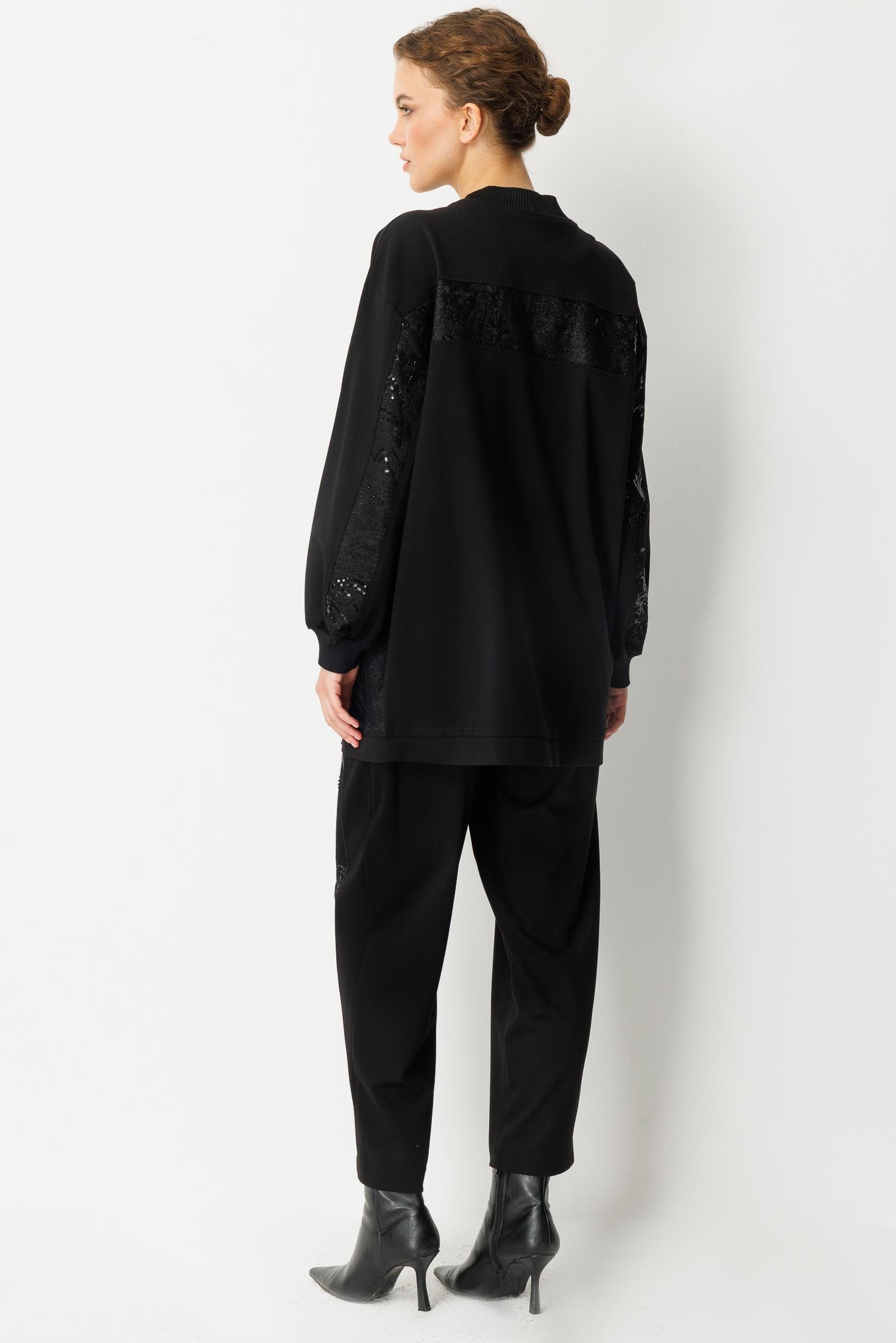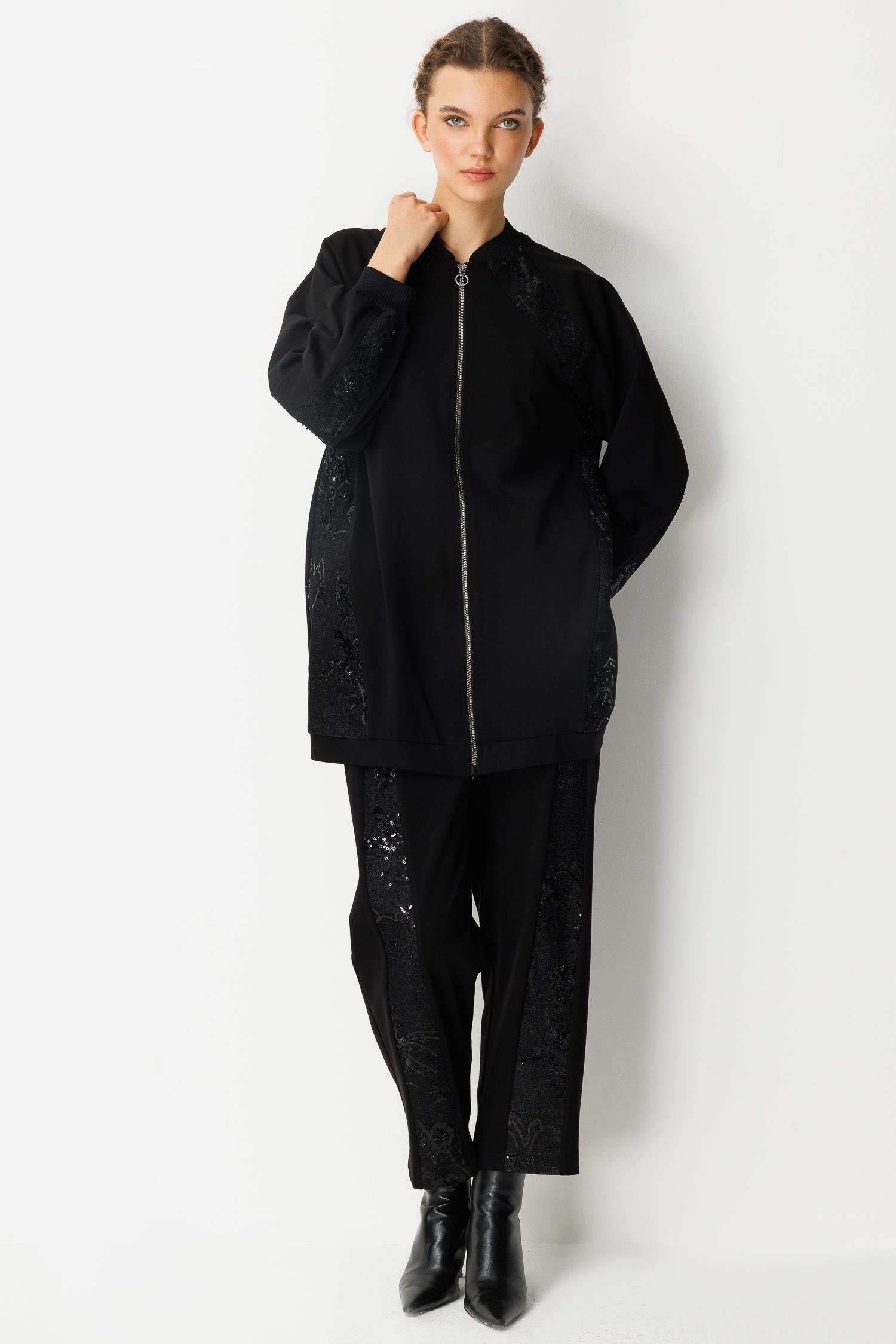 Fermuar kapamalı, pantolon beli lastikli, blok geçişli, yakası ve kol ucu ribanalı, payet detaylı alt üst takım-