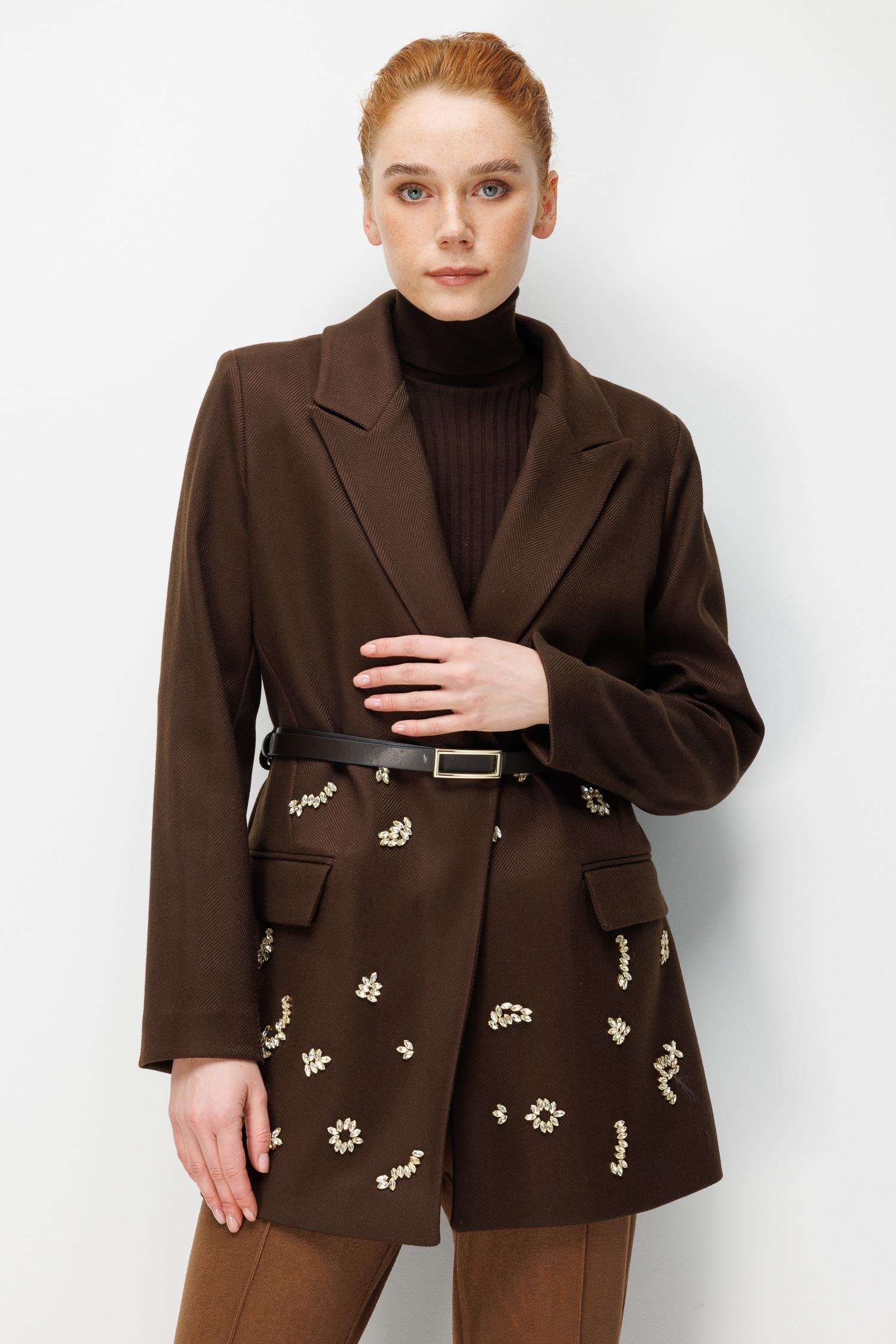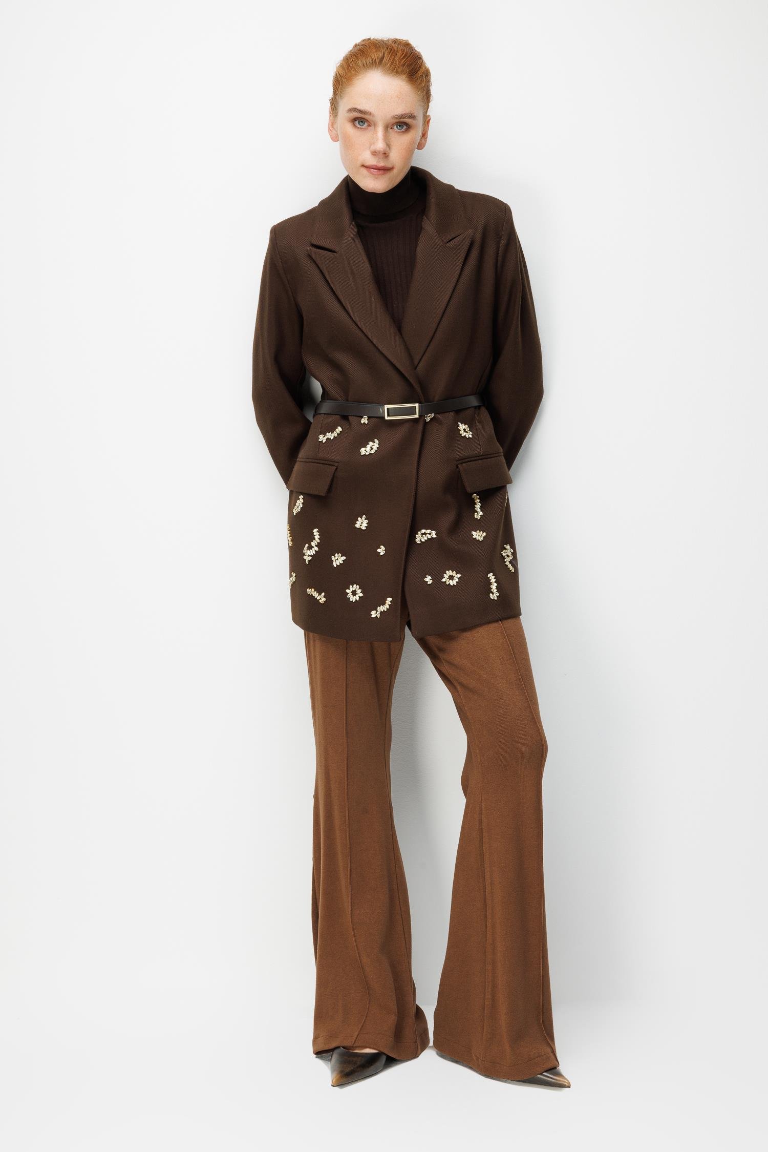 Kruvaze yaka, cep kapaklı, taş işleme detaylı, belden kemerli ceket-